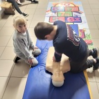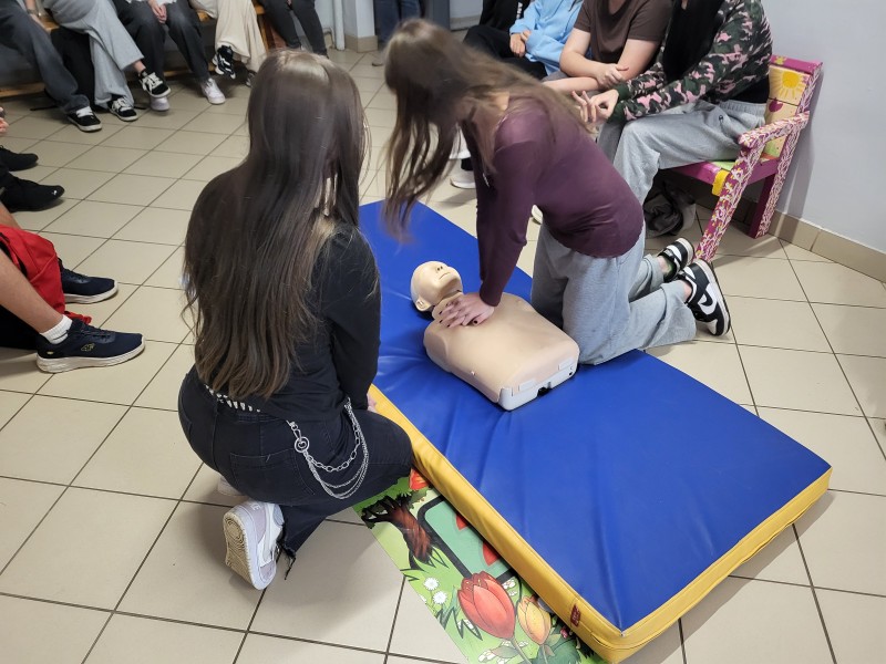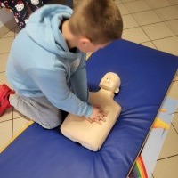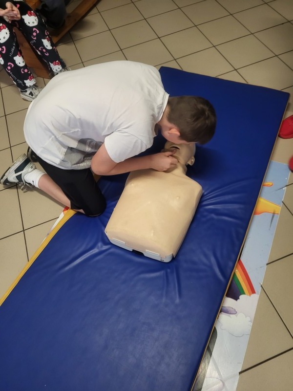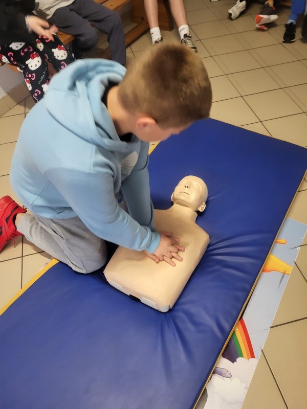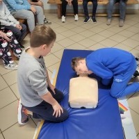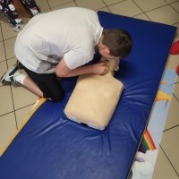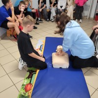 30 uciśnięć i 2 wdechy – to podstawowa zasada resuscytacji krążeniowo-oddechowej. Na fantomach uczniowie przeprowadzali czynności ratujące życie. Każdy uczestnik z wielkim zaangażowaniem wykonywał swoje zadania.